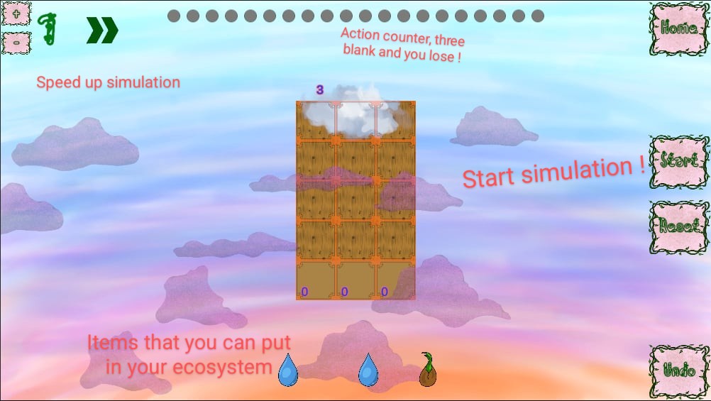 Each level presents you with a grid and a selection of different elements to build your ecosystem. It's up to you to discover how each element behave in order to make a beautiful loop. Once you set all your pieces, press start and watch the magic happen... or just your system collapse !